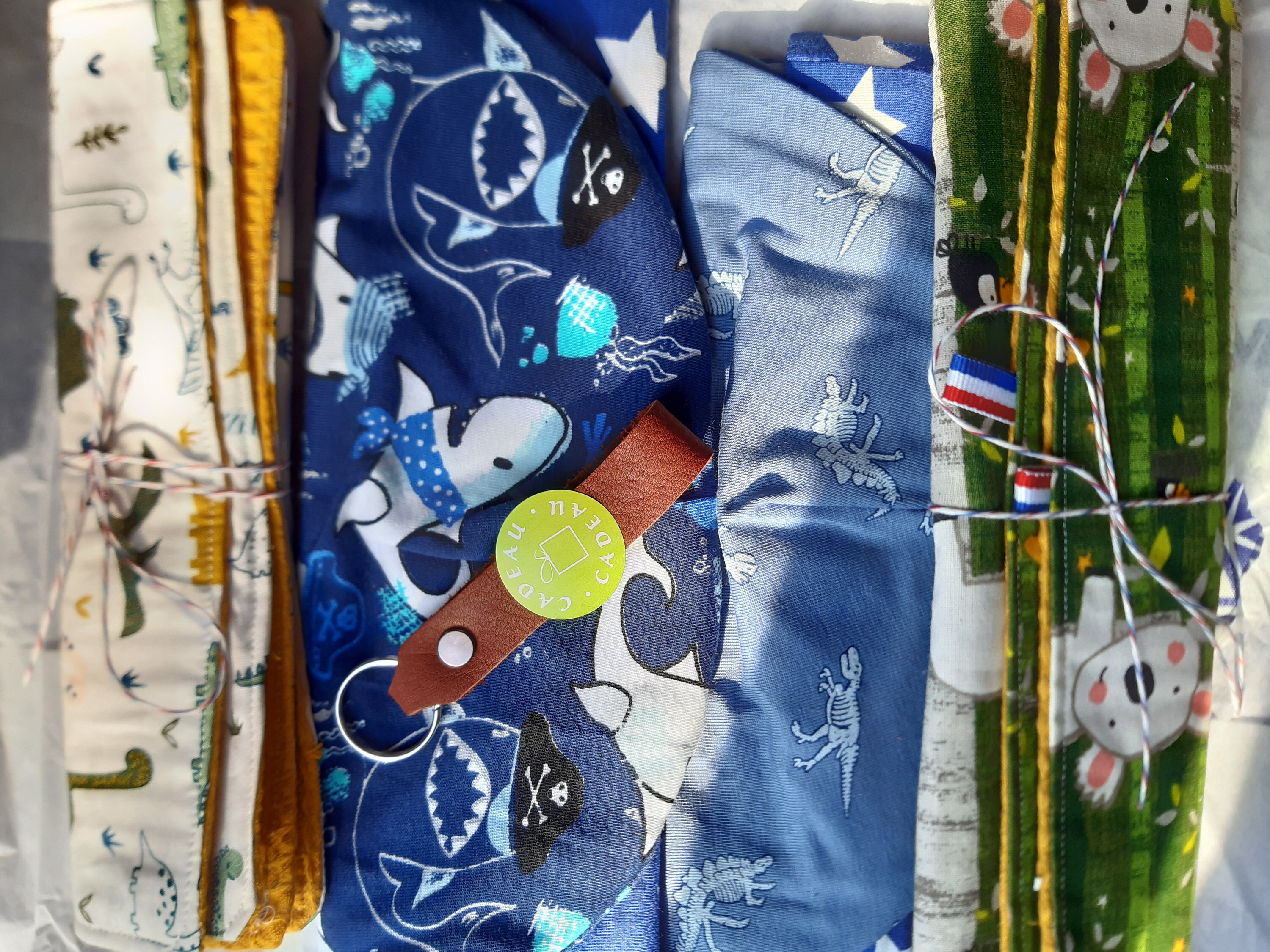 - Serviettes de table lavables pour enfants en coton imprimé certifié oeko-tex et nid d’abeilles OU coton imprimé certifié oeko-tex et éponge bio, absorbantes et douces. Voir les photos pour le stock restant.