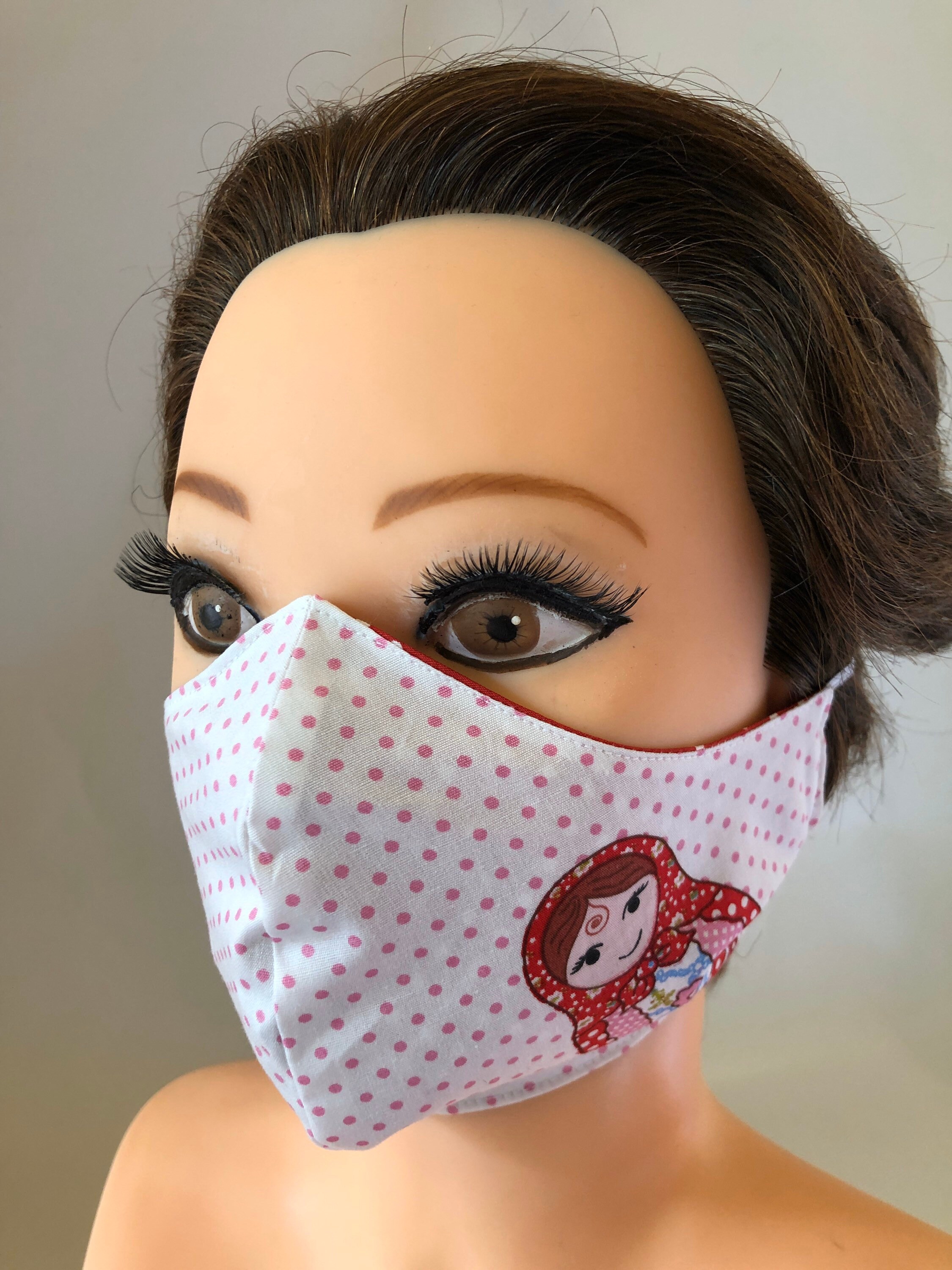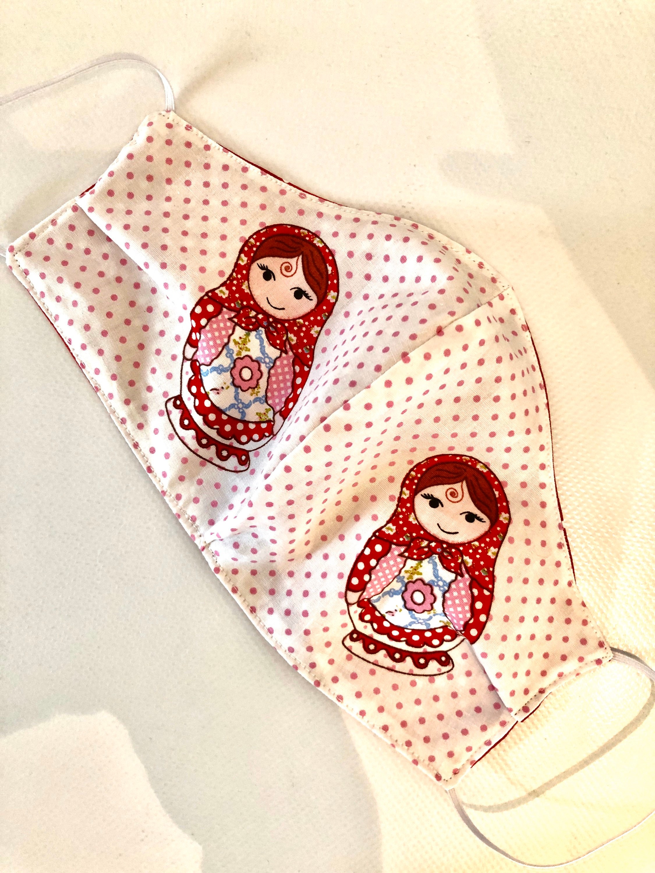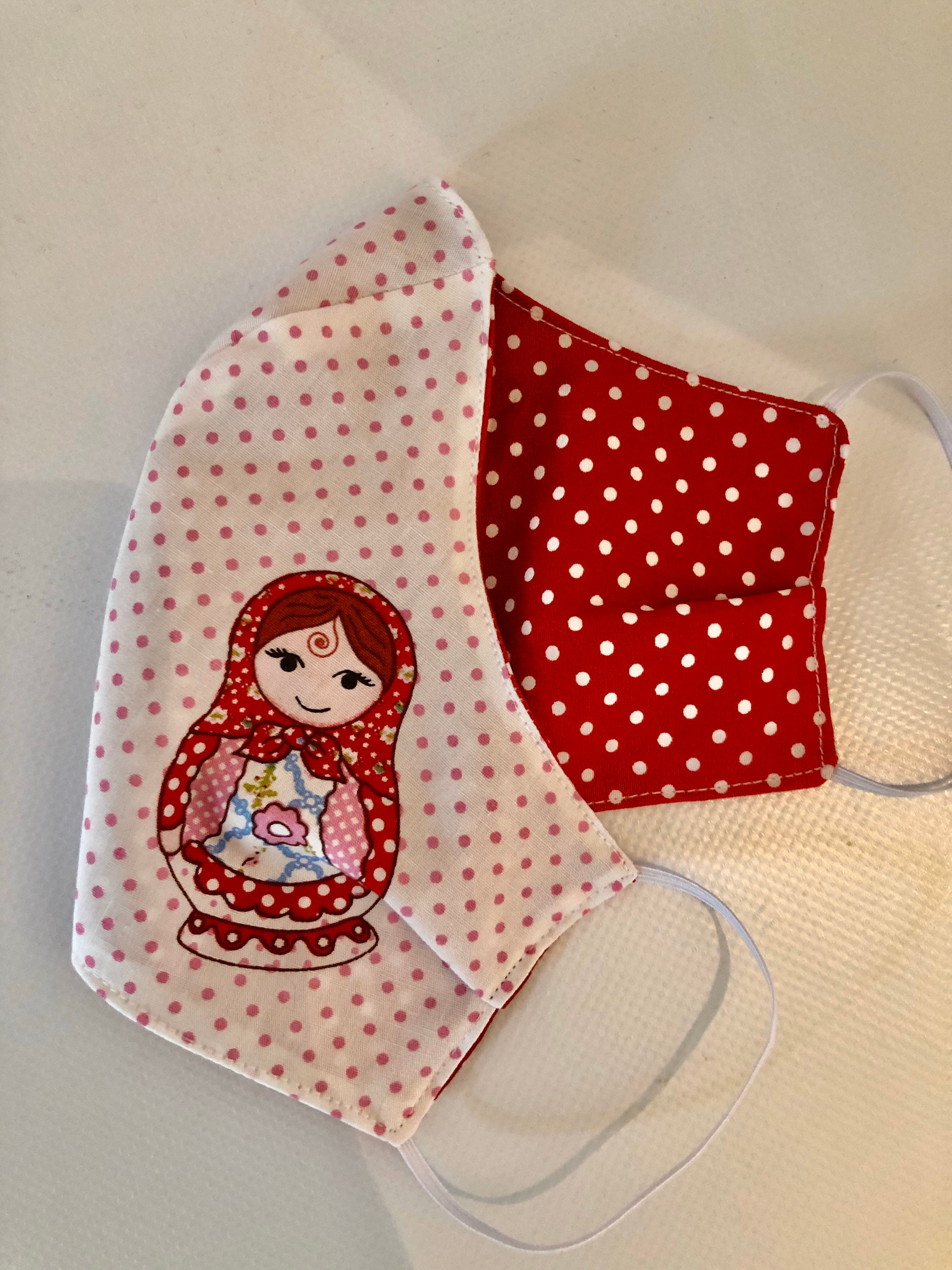 Washable 3 layers, Reversible Cotton Face Mask Russian dolls matryoshka and red polka dots
