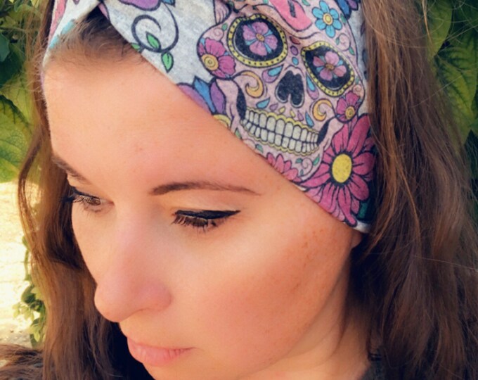 Dark blue sugar skulls Knotted Headband, Turban Headband, Fabric Headband, Sports/Yoga headband, Mother’s Day Gift, Women’s Gift